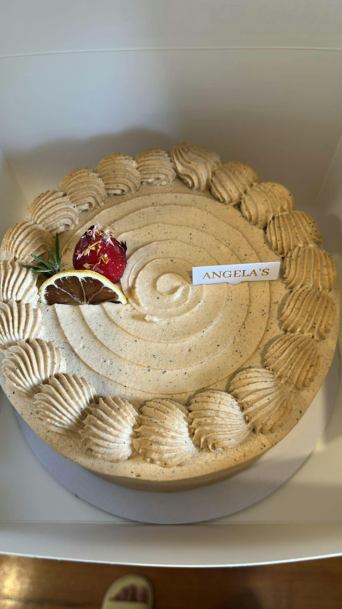 The entire creation is beautifully covered in a smooth earl grey-infused cream, adding an extra layer of depth and luxury to each mouthful.